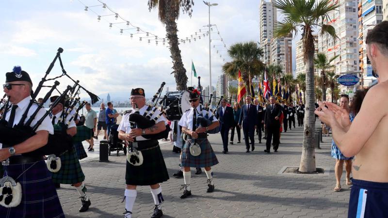 At 3:45 p.m., the traditional banner parade began on Castellón Avenue, accompanied by the Torrevieja Pipes and Drums, adding colour and melody to a day dedicated to remembrance. Hundreds of people followed the procession along the Levante promenade, applauding and taking photos with the participants. This was especially true for veterans, such as Raymond Barber, a 93-year-old British man who has lived in Benidorm for four decades and who wore the same uniform he wore when he served as a sailor more than 70 years ago.