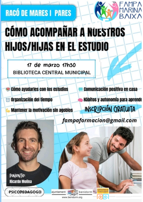 El encuentro, titulado “Cómo acompañar a nuestros hijos/hijas en el estudio”, será impartido por Ricardo Molina, quien compartirá estrategias prácticas, ideas sencillas y reflexiones útiles para convertir el momento de estudio en una experiencia más motivadora, organizada y enriquecedora para toda la familia.