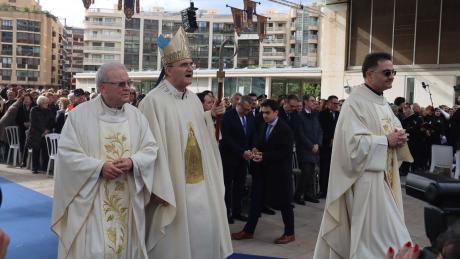 Una vez en la plaza, a las 11,30 horas se ha iniciado la ceremonia religiosa, una Eucaristía de Acción de Gracias que ha sido presidida por el obispo de la diócesis Orihuela-Alicante, José Ignacio Munilla Aguirre, acompañado por todos los sacerdotes de la localidad. La misa ha sido cantada por la Agrupación Coral de Benidorm y ha tenido la participación de las bandas del municipio: Unión Musical, Societat Musical L’Illa, y Societat Musical La Nova, además de la colaboración de la Camerata Ars Cantica, la ACR La Barqueta o los cantores del himno del Centenario. A todos ellos, así como a la Comisión del Centenario, el párroco Juan Antonio González ha agradecido uno por uno “el mucho y duro trabajo”. González también ha tenido palabras para el compositor del himno, Juan Antonio Espinosa; la autora del cartel y logo, Mari Carmen Zaragoza “y al pueblo de Benidorm por su colaboración tan generosa”.