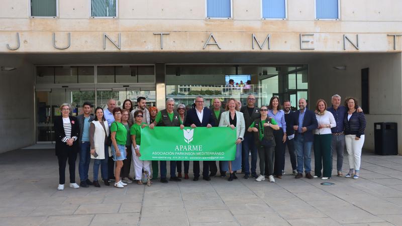 La Corporación municipal, encabezada por el alcalde, Toni Pérez, y por la concejal de Bienestar Social, Ángela Zaragozí, acompañada de integrantes de APARME (Asociación Parkinson Mediterráneo), se ha concentrado hoy en la Plaza de SSMM Reyes de España para dar visibilidad a esta enfermedad neurodegenerativa.