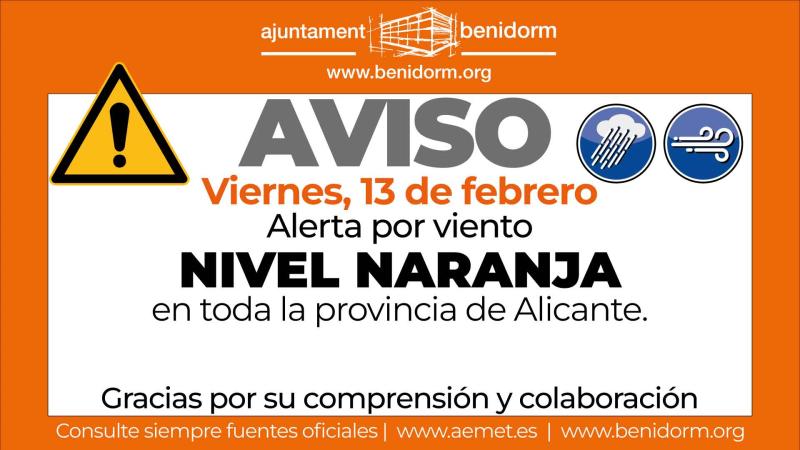 Asimismo, se pide a la población evitar desplazamientos innecesarios, mantener los toldos de las viviendas recogidos, retirar de balcones o repisas macetas y otros elementos que no estén sujetos, adoptar la máxima precaución en actividades y espacios al aire libre y estar atentos a posibles actualizaciones y comunicaciones oficiales, a través de los canales de información y redes sociales del Ayuntamiento de Benidorm y de la Policía Local.