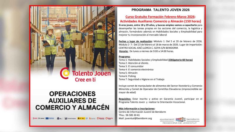 La Concejalía de Juventud del Ayuntamiento de Benidorm, en colaboración con la Cámara de Comercio de Alicante, va a organizar un curso de Operaciones Auxiliares de Comercio y Almacén, de 150 horas de duración. Será un curso gratuito que se desarrollará del 5 de febrero al 18 de marzo, de lunes a viernes y de 9 a 14 horas.