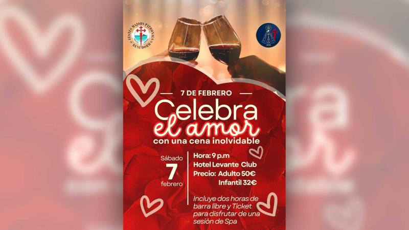 La cena de los enamorados tendrá lugar en el hotel Levante Club a las 21 horas. Todas las personas que quieran acudir a disfrutar de una velada inolvidable, pueden adquirir su entrada en la Casa del Fester los lunes, miércoles y viernes de 19 a 21 horas.