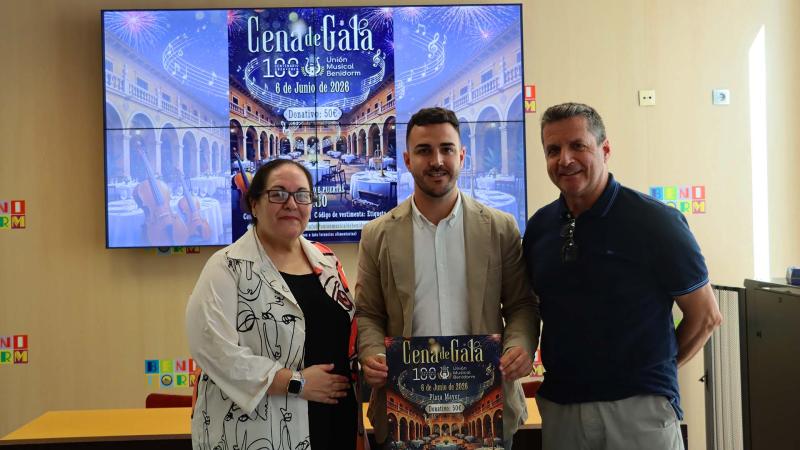 La Unión Musical de Benidorm sigue avanzando en la programación de los actos con motivo de su centenario y esta mañana ha anunciado la celebración de la Cena de Gala que tendrá lugar el próximo 6 de junio en la Plaza Mayor de la ciudad. Así lo ha avanzado el concejal de Cultura, Jaime Jesús Pérez, que ha estado acompañado por la presidenta de la UMB, Mari Carmen García, y por Francisco Juan, presidente de la comisión del Centenario.