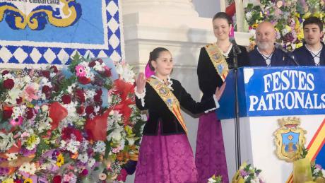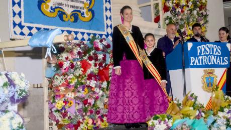 La romería ha recorrido el Paseo de la Carretera, la Alameda, la calle Mayor y la plaza de Sant Jaume. A su llegada, la imagen de la patrona ha sido situada bajo el pórtico de la iglesia, donde progresivamente se han ido depositando ramos y cestas de flores hasta rodearla por completo. Las últimas en realizar su ofrenda han sido las damas de las Fiestas y sus reinas, Laura y Carmen, así como el alcalde y los concejales en representación de toda la ciudad.