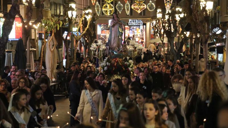 Las calles del casco antiguo de Benidorm celebraron ayer la recuperación de una de las tradiciones locales más populares como es la Inmaculada Concepción. Tras varios años sin que hubiera comisión, este año se ha conformado una presidida por Maite Rostoll y diez mayoralas y un total de 54 niñas Hijas de María, en su mayoría damas y exdamas de las Festes Majors Patronals.