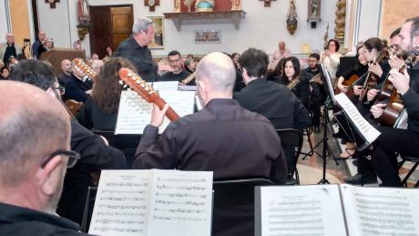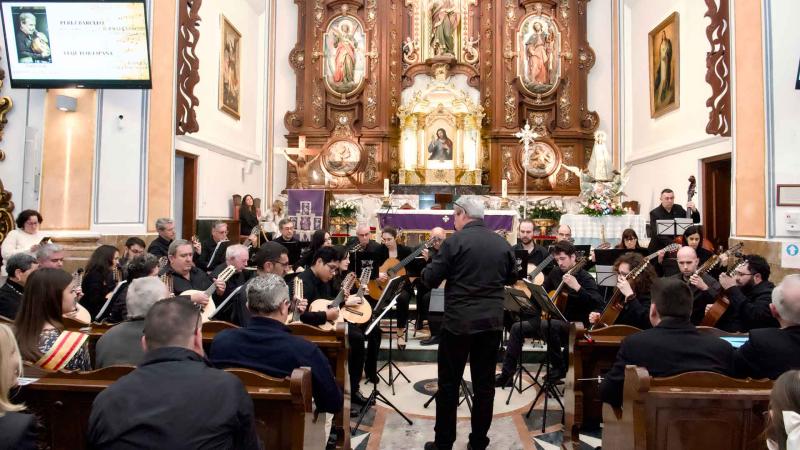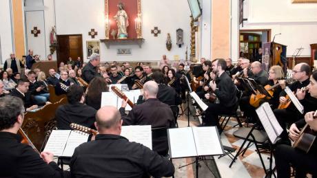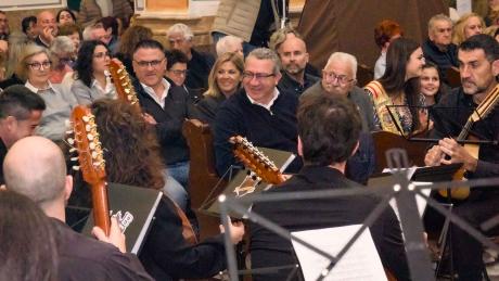 Tras un recorrido sucinto de sus cuarenta años de historia, el primer director que tuvo la Orquesta de Pulso y Púa, Juan Francisco Pérez Lapera, la ha dirigido en el estreno por la rondalla del pasodoble ‘Pérez Barceló’, de Bernabé Sanchis y en la melodía popular ‘Viaje por España’, en una adaptación propia.