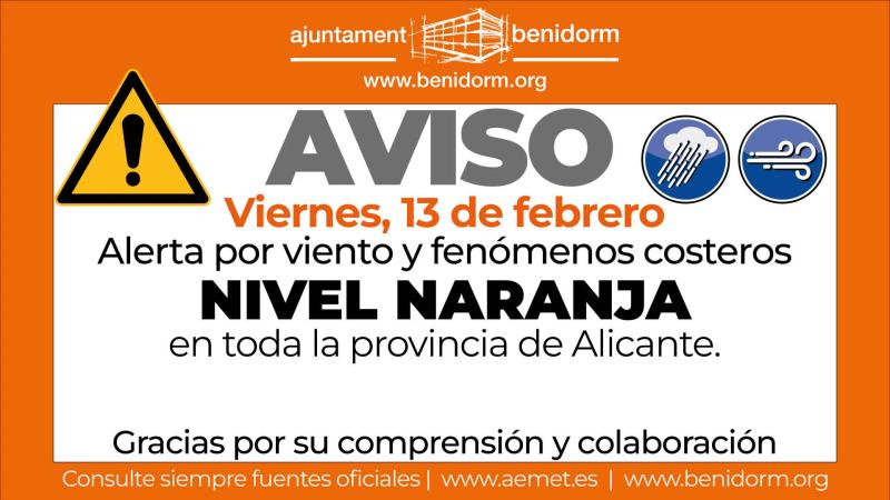 Asimismo, se pide a la población que evite desplazamientos innecesarios, que adopte la máxima precaución en actividades y espacios al aire libre, y que esté atenta a posibles actualizaciones y comunicaciones oficiales, a través de los canales de información y redes sociales del Ayuntamiento de Benidorm y de la Policía Local.