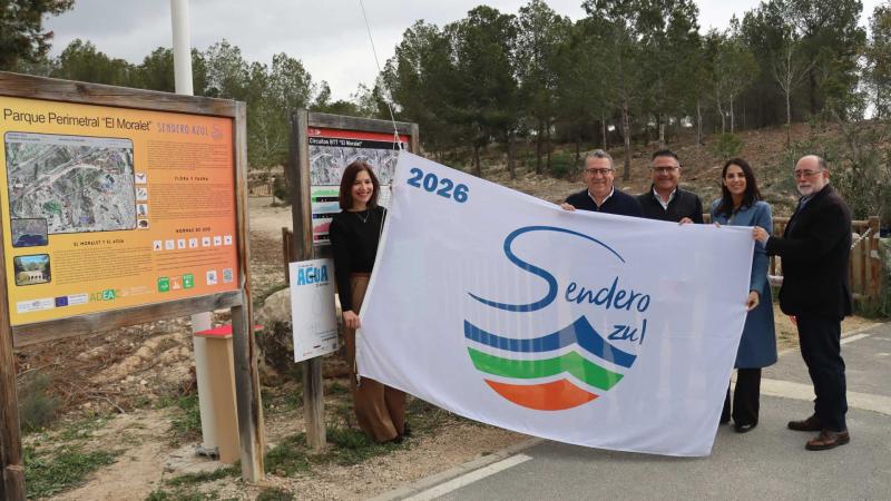 El parque El Moralet luce desde hoy viernes, y por segundo año consecutivo, el prestigioso reconocimiento ‘Bandera Sendero Azul 2026’ que le ha otorgado la Asociación de Educación Ambiental y del Consumidor (ADEAC) al Sendero Perimetral de este parque urbano “por los esfuerzos dedicados a la recuperación, mantenimiento y puesta en valor del sendero” por parte del Ayuntamiento de Benidorm. El alcalde de la ciudad, Toni Pérez, junto a los ediles de Medio Ambiente y de Parques y Jardines, Mónica Gómez y José Ramón González de Zárate, han izado hoy esta bandera medioambiental en el acceso al Moralet desde la Vía Parque, en presencia de otros ediles de la Corporación y de personal municipal.
