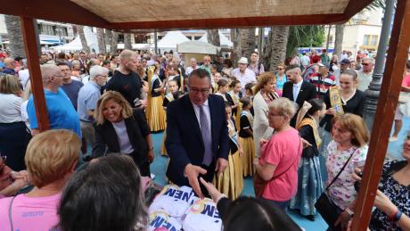 Como cada año, coincidiendo con la celebración del 9 d’octubre, este mediodía ha abierto sus puertas la ‘Fira de Productes Típics de la Terra’, que organiza la Comissió de Festes Majors Patronals y que se desarrolla en el Parque de Elche. El alcalde, Toni Pérez; la concejal de Fiestas, Mariló Cebreros; y las Reinas de les Festes, Paula Pascual y Aitana Pérez, han sido los encargados de cortar la cita inaugural de la Fira. Previamente, y como es tradición en el Dia de la Comunitat Valenciana, las Reinas y sus cortes de honor han interpretado, a ritmo de ‘xirimita i tabalet’, el ‘ball del peuet’ en la plaza de SS MM Los Reyes de España ante la atenta mirada de residentes y turistas. Un tradicional baile que ha tenido lugar justo después de la finalización del pleno institucional del 9 d’Octubre.