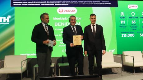El alcalde de Benidorm, Toni Pérez, ha recibido este jueves un nuevo reconocimiento para la ciudad por su modelo turístico transformador y sostenible. En este caso, de la mano de la empresa Veolia, unos galardones que se han librado en el espacio denominado TechYsostenibilidad de FiturTech y con los que se ha valorado el trabajo desarrollado por la ciudad en materia medioambiental, alcanzando los más altos estándares de calidad.